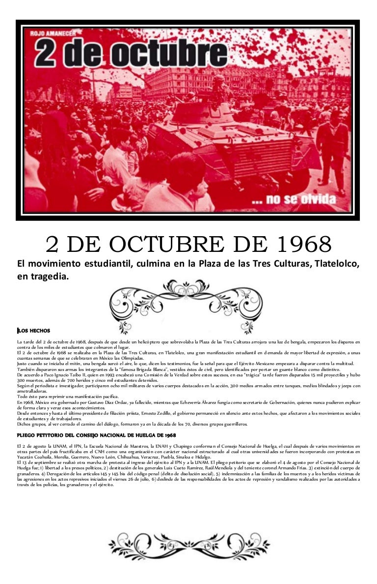 Ir a Google Play ahora Regina. 2 DE OCTUBRE NO SE OLVIDA Para conmemorar la masacre de estudiantes del 2 de octubre de 1968 ocurrida en Tlatelolco por manos el ejército mexicano el colectivo Espacio KRUZ en defensa de la tierra y el territorio los invitamos a la proyección del documental Tlatelolco las claves de la masacre a partir de las 4 de la tarde del día domingo 2 de. 2 de octubre no se olvida del autor Antonio Velasco Piña.